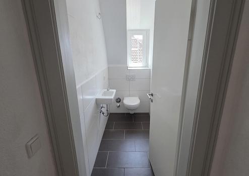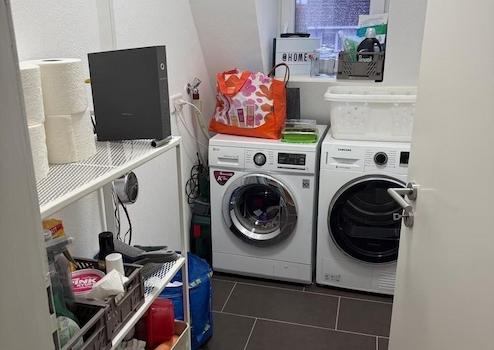 Das Tageslichtbad hat sowohl eine Badewanne als auch eine separate Dusche. Zusätzlich gibt es noch ein Gäste-WC und einen kleinen Hauswirtschaftsraum mit Waschmaschinenanschluss direkt in der Wohnung. Die Fugen im Hauswirtschaftsraum und im Badezimmer wurden ebenfalls gerade neu saniert.