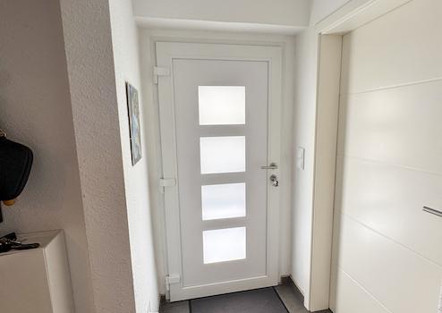 Dieses charmante Reiheneckhaus wurde 1927 erbaut, frisch modernisiert und vor kurzem um einen modernen Anbau erweitert. Das Ziegelhaus präsentiert sich in einem gepflegten Zustand und liegt in einer ruhigen Stichstraße (Sackgasse), hier befinde sich auch der Hauseingang. Die moderne Aluminium-Haustür mit Edelstahlstangengriff liegt geschützt unter einem Vordach und ist über zwei mit Keramikplatten belegte Stufen bequem zu erreichen.