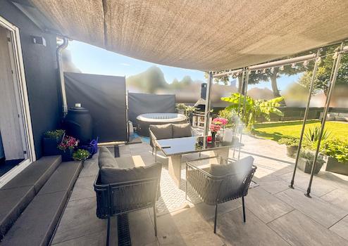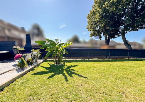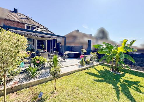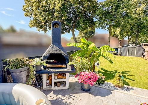 Im Außenbereich lädt eine großzügige, überdachte Terrasse mit Keramikplattenbelag, Grillplatz, Randstein- und Kiesbeeten sowie gepflegter Rasenfläche zum Verweilen ein. Das Grundstück ist komplett mit einem verzinkten Stabgitterzaun eingefriedet. Im hinteren Gartenbereich befindet sich eine weitere Terrasse sowie ein stabiles Stahlgerätehaus. Ein Zugang von der Rückseite des Grundstücks ist jederzeit möglich; eine Garage könnte hier nachträglich errichtet werden.