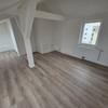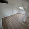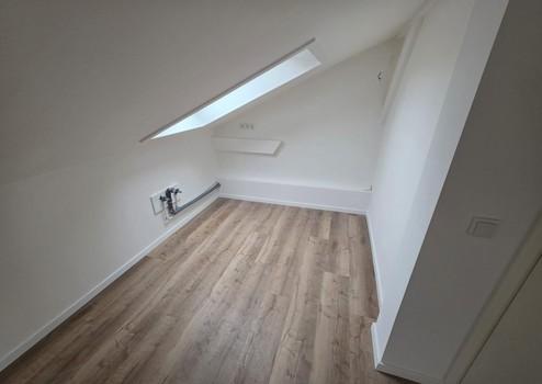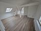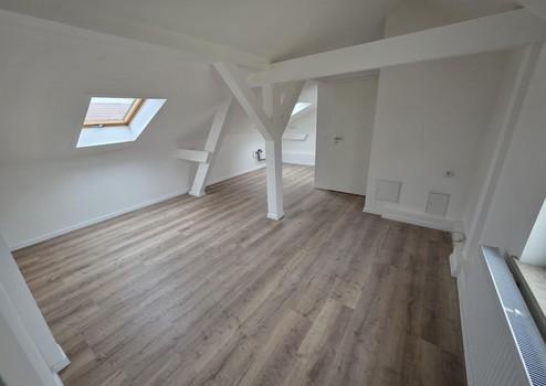 Der helle Wohnraum mit sichtbaren Dachschrägen und tragenden Balkenelementen schafft eine besondere Atmosphäre. Der hochwertige Bodenbelag in Holzoptik sorgt für Wärme und Wohnlichkeit, während die weißen Wände und klaren Linien ein modernes Gesamtbild erzeugen.