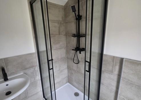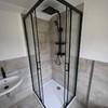Ausgestattet mit einer großzügigen Regendusche, anthrazitfarbenen Armaturen, moderner Glasduschkabine und zeitlosen Fliesen – stilvoll, hochwertig und absolut zeitgemäß.
