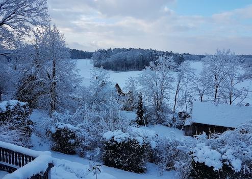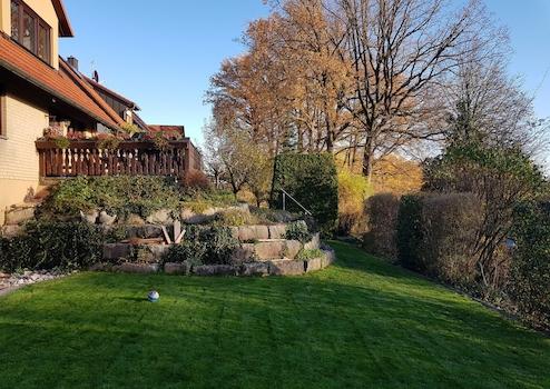 Der Garten liegt auf der Südseite und hat den ganzen Tag Sonne. In dem von einem Zimmermann errichteten und gedämmten Gartenhaus können Gartengeräte gelagert werden. Der Garten hat eine ca. 6000 Liter große Zisterne, somit kann der Garten im Sommer mit Regenwasser bewässert werden.
