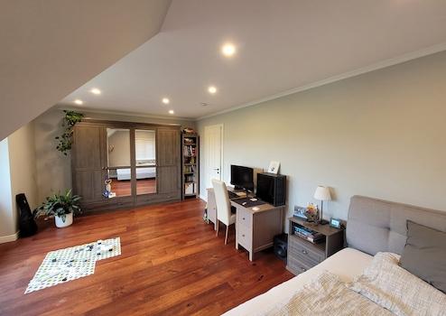 Das Obergeschoss wurde erst 2021 ausgebaut. Hierbei wurden beidseitig 9m breite Dachgauben mit je 6 Fenstern verbaut, um Wohnraum und Licht zu gewinnen.