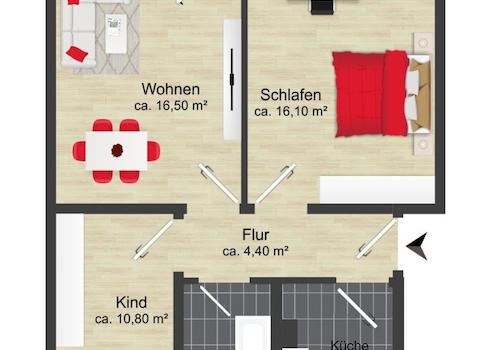 Die 3-Raum-Wohnung im 2. Obergeschoss ist wie folgt aufgeteilt: