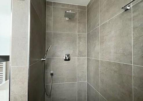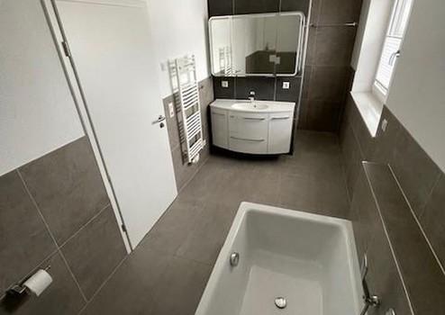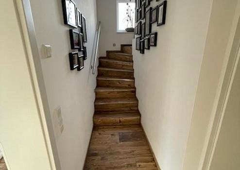 Über eine hochwertig geflieste Betonfertigtreppe gelangen Sie in das Obergeschoss mit Blick in den Garten. Hier befinden sich 3 Schlafzimmer sowie ein Tageslichtbad mit begehbarer Dusche und einer großzügigen Badewanne.
