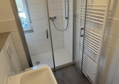 – Modernisiertes Badezimmer mit ebenerdiger Dusche, Hänge-WC und Handtuchheizkörper