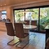 Die große Fensterfront im Essbereich sowie die seitliche im Wohnzimmer sind mit elektrischen und zeitgesteuerten Innenrollos ausgestattet.