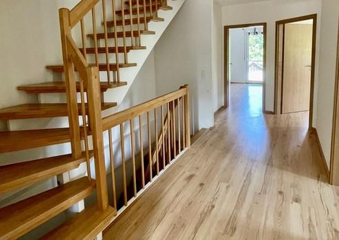 Sie betreten das Haus über eine massive Alu/Holz-Haustür (Einbau 2021) in einen hellen und einladenden Eingangsbereich mit viel Platz. Vom Flur aus gelangen Sie in die insgesamt drei Zimmer auf dieser Etage und in das Badezimmer mit Dusche und Badewanne. Die helle Buchentreppe verbindet alle Etagen von hier aus.