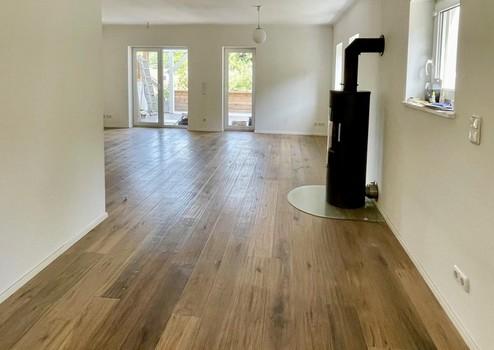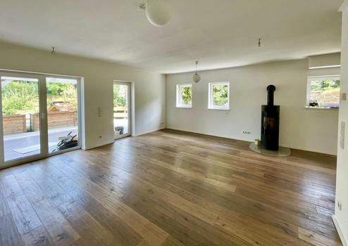 Da es sich um ein Haus am Hang handelt, befinden sich im hellen UG das Herzstück des Hauses, die offene Küche mit Essbereich und dem angrenzenden großen Wohnraum mit Eichendielenparkett und einem Holzofen.