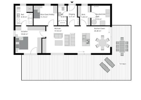 Der moderne Winkelbungalow mit Walmdach präsentiert einen Entwurf, der mit einem lichtdurchfluteten Wohn-/Ess- und Kochbereich von 51 m² das Herzstück bildet. Hier ist ausreichend Platz für eine großzügige Küche, eine Kochinsel, einen geräumigen Essbereich und einen Wohnbereich mit TV, um allen Wohnbedürfnissen gerecht zu werden. Die Grundrissplanung umfasst zudem einen gemütlichen Schlafbereich mit Ankleide und Bad in einer durchdachten Raumfolge. Ein praktischer Raum für die Hauswirtschaft ist direkt an dieses Refugium angeschlossen, um die Wäsche dort zu versorgen, wo sie anfällt. Eine geräumige Diele, ein optional gestaltetes Duschbad sowie ein zusätzlicher Raum, der flexibel als Büro, Gäste- oder Hobbyraum genutzt werden kann, vervollständigen das Raumangebot. Der Eingangsbereich ist durch den Gebäudewinkel überdacht und verleiht dem Gesamtbild eine einladende Note.