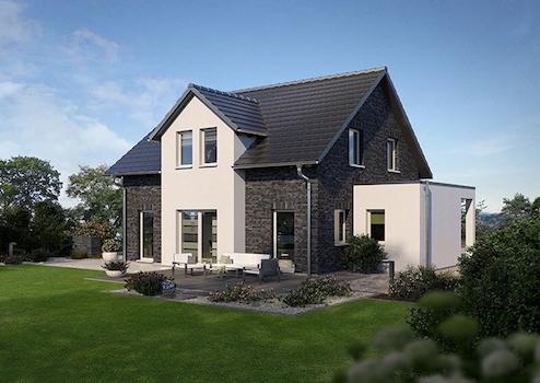 Gestaltungsfreiheit inklusive: Der vorgestellte Entwurf dient als Inspiration. Hausgröße, Dachformen, Fenstergrößen und -positionen lassen sich nach Ihren Wünschen individuell anpassen. Bitte beachten Sie: Abgebildete Anbauteile sind teilweise nicht im Preis enthalten.