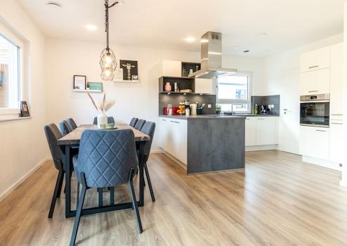 Die Küche ist separat angelegt, aber zum Ess-/ und Wohnbereich hin offen gestaltet. Direkt neben der Küche