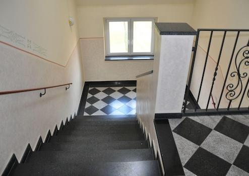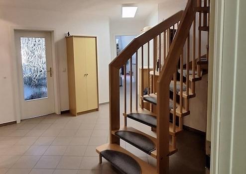 Die Bodenbeläge in der Wohnküche, im Flur sowie in den Bädern sind mit hochwertigen Fliesen ausgestattet. In den übrigen Wohnräumen ist ein hochwertiger, neutraler und sehr gepflegter Teppichboden verlegt. Ein Aufzug sowie ein fahrzeugeigener Stellplatz sind nicht vorhanden. Es gibt rund um das Haus ausreichend Stellplatzmöglichkeiten.