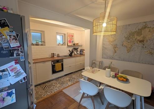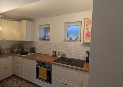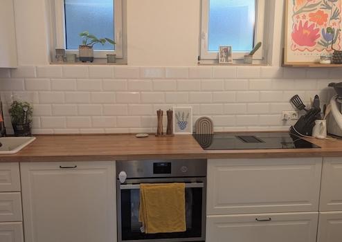 An diesen schließt sich die Küchenzeile an. Die Küche wurde 2021 eingebaut und wird mitverkauft. Des Weiteren kann der Kühlschrank bei Bedarf in der Wohnung verbleiben.