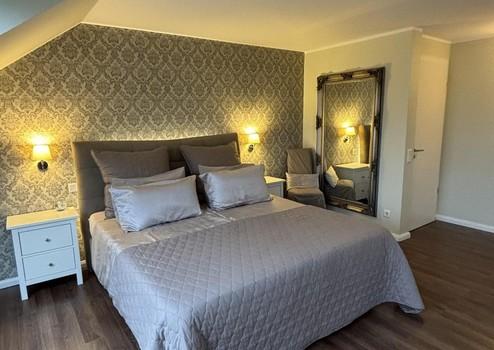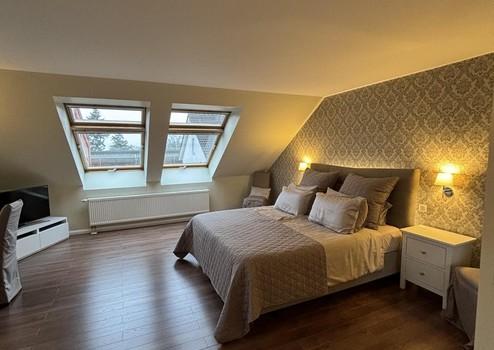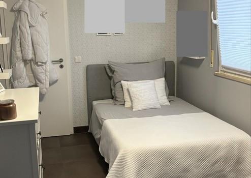 Im Obergeschoss warten zwei freundliche Kinderzimmer und im ausgebauten Dachgeschoss das große Elternschlafzimmer mit eigener Ankleide – ein Rückzugsort, der Ruhe und Ordnung vereint.