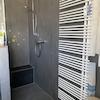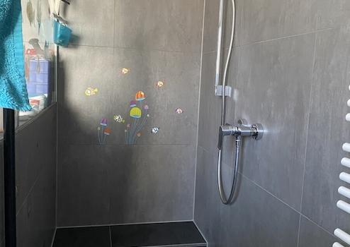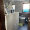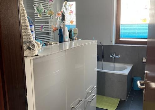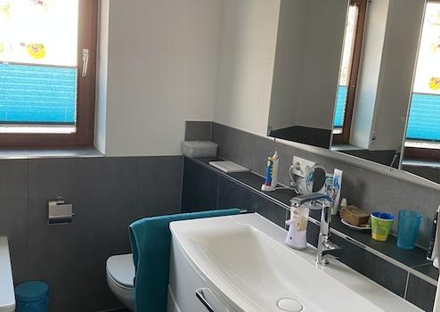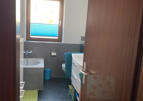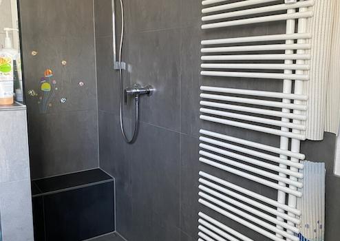 Das Badezimmer wurde 2017 umfangreich renoviert und mit großen Fliesen und einer elektrischen Fußbodenheizung ausgestattet. Die Dusche ist barrierefrei. Des Weiteren sind eine Badewanne und der Anschluss für die Waschmaschine vorhanden. Die abgehängte Decke rundet das moderne Ambiente ab.
