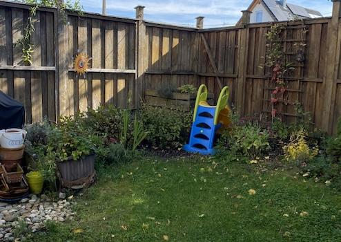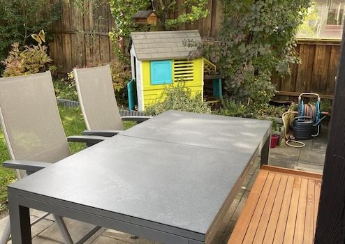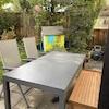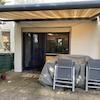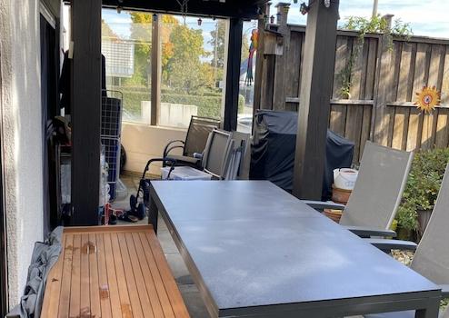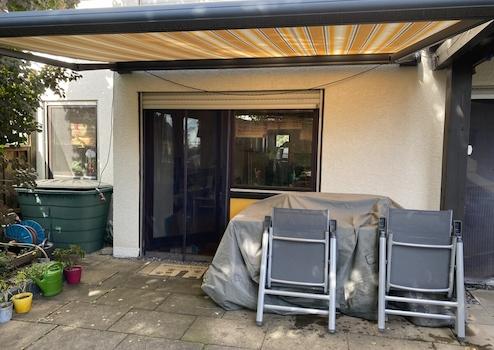 Die Terrasse ist durch einen darüberliegenden Balkon zum Teil überdacht. 2017 wurde hier eine elektrische Markise mit Sonne/Windwächter montiert.