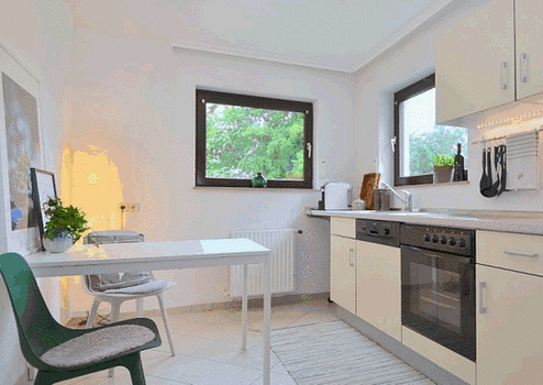 Waschmaschine, Einbauküche mit Kühlschrank, Gefrierer, Spülmaschine, Backofen und Kochplatte/Ceranfeld. Teilmöblierung möglich (Schränke, Sofa, Fernseher, Esstisch und Stühle)