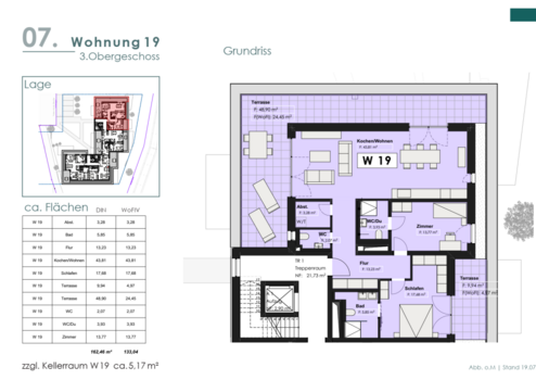 Das Angebot bezieht sich auf die Penthousewohnung 19 im 1. Staffelgeschoß Haus 24. Sie gelangen über eine geräumige Diele mit Garderobe in die Wohnung. Von der Diele gelangen Sie in das helle Kinderzimmer/Büro von ca. 14 m² mit eigenem Duschbad sowie in den Elternprivatbereich bestehend aus dem Elternschlafzimmer von ca, 18 m² mit Ausgang auf die Dachterrasse 1 von ca. 10 m ² sowie mit Zugang in das Elternbad von ca. 6 m². Von der zentralen Diele gelangen Sie desweiteren in den hellen geräumigenWohn/Eßbereich mit offener Küche von insgesamt 44 m² und Ausgang auf den große sonnigen Dachterrasse von ca. 48 m².