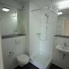 - modernes Bad mit großem Spiegel, Waschbecken, WC, Dusche.