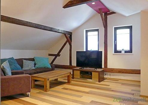 ### Please note the availability date! Bitte das Verfügbarkeitsdatum beachten! ### hübsches möbliertes Apartment im 3.Obergeschoss = Dachgeschoss, unweit zur Jenaer Innenstadt; helles Wohnzimmer mit Couch, Sesseln, ...