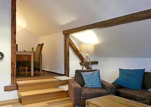 ### Please note the availability date! Bitte das Verfügbarkeitsdatum beachten! ### höbsche möblierte Wohnung in ruhiger Wohnlage in Waldkappel; WLAN; großes Wohnzimmer mit modernen rustikalen Möbeln, Sofa, Esstisch, ...