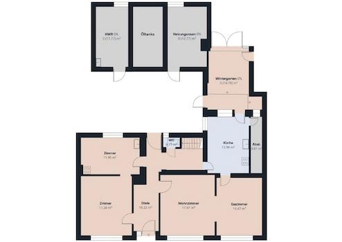 Die Küche schließt funktional an und bildet den Mittelpunkt des Alltags. Von hier gehst du weiter in den Wintergarten, der als geschützter Übergang zwischen Haus und Außenbereich dient. Ergänzt wird das Erdgeschoss durch weitere flexibel nutzbare Zimmer, ein Gäste-WC sowie praktische Nebenflächen, die deinen Alltag angenehm unterstützen.