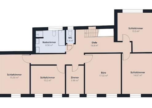 Das Obergeschoss ist als privater Rückzugsbereich gestaltet. Eine großzügige Diele verbindet die Räume offen hell. Mehrere Zimmer verteilen sich über diese Ebene, gut geschnitten und vielseitig nutzbar – für Familie, Gäste oder individuelle Bedürfnisse. Ein großzügiges Büro bietet dir ideale Voraussetzungen für Homeoffice oder kreative Tätigkeiten. Ein Tageslichtbad sowie ein separates WC ergänzen das Obergeschoss funktional, ein zusätzlicher kleiner Raum eignet sich perfekt als Ankleide oder Stauraum.