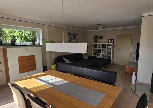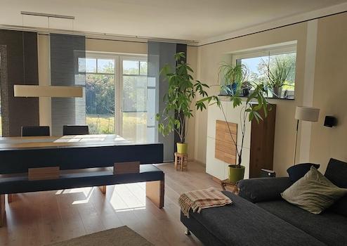 Der offene Wohn- und Essbereich mit direktem Zugang in den Garten bietet viel Platz für Familienleben und gesellige Abende.