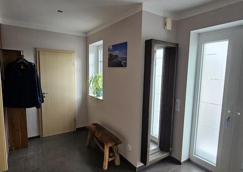Für zusätzlichen Wohnkomfort sorgen Fußbodenheizung in mehreren Räumen, bodentiefe Fenster, ein Kaminofen sowie Jalousien. Der Hauswirtschaftsraum ist großzügig geschnitten und direkt von der Garage aus begehbar – so gelangen Sie auch bei Regen trocken ins Haus.