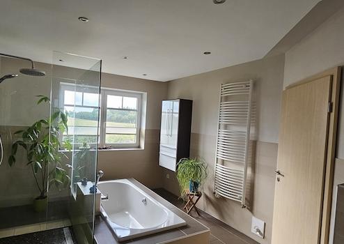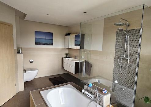 Der moderne Grundriss ist ideal für Familien: In der ersten Etage befindet sich das Kinderbadezimmer, das bequem von den beiden angrenzenden Kinderzimmern links und rechts betreten werden kann. Das Hauptbadezimmer hat eine schöne Badewanne und eine bodentiefe Dusche.