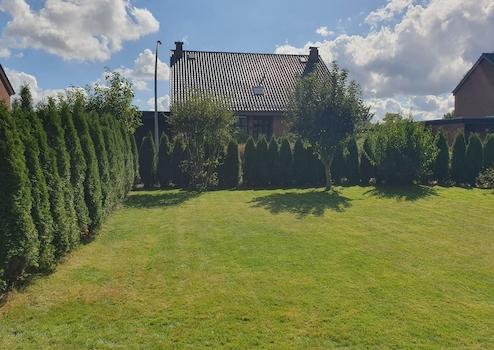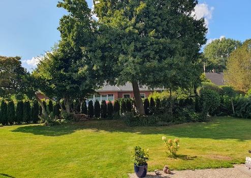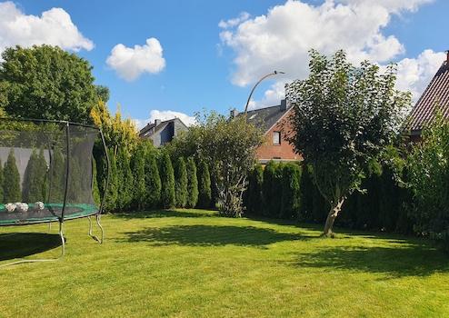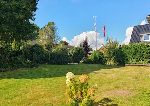 Viel Platz zum Gärtnern, Spielen oder Entspannen bietet der Garten des 900 Quadratmeter großen Grundstücks. Die Außenanlagen bieten noch viel Raum für kreative Ideen, bestechen aber durch eine pflegeleichte Bepflanzung.
