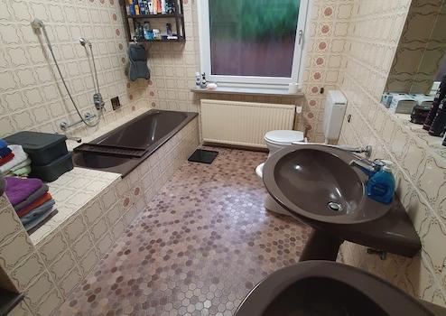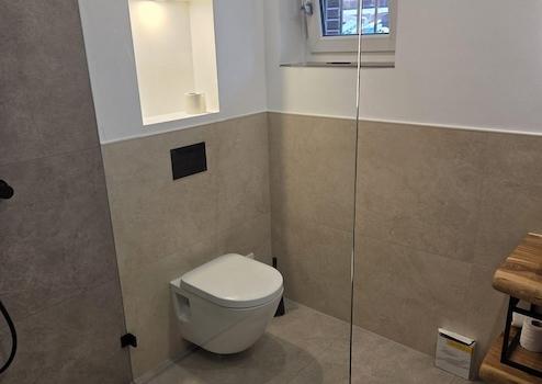 Das Haus besitzt ein großes Hauptbad inkl. Dusche, Badewanne, zwei Waschbecken und einem Bidet sowie ein 2025 gebautes Gäste-Bad inkl. ebenerdiger Dusche. Im Obergeschoss befindet sich noch ein WC mit Waschbecken.