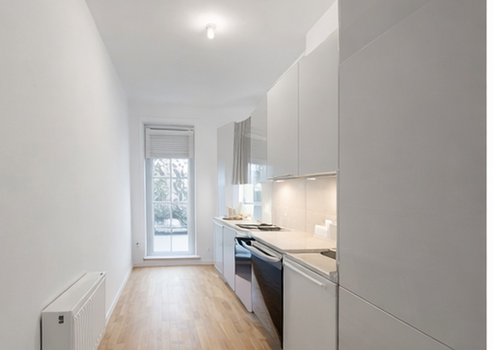 Die Wohnung selbst überzeugt vor allem mit dem Grundriss: Auf 85 Quadratmetern finden sich drei ähnlich große Zimmer, darunter ein Schlafzimmer zum Garten. Auch der Balkon ist rückwärtig gelegen, still und sonnig. Der Balkon ist über die Küche zugänglich, was auch für WG-Vermietung ideal wäre. Das Bad verfügt über ein Fenster und es gibt eine Abstellkammer in der Wohnung.