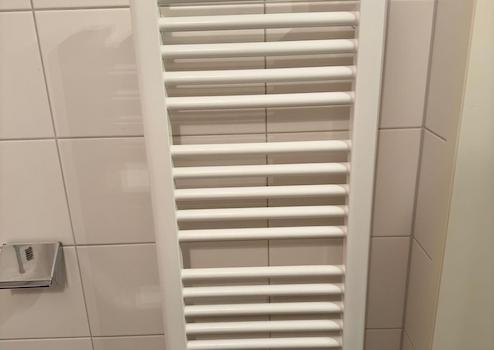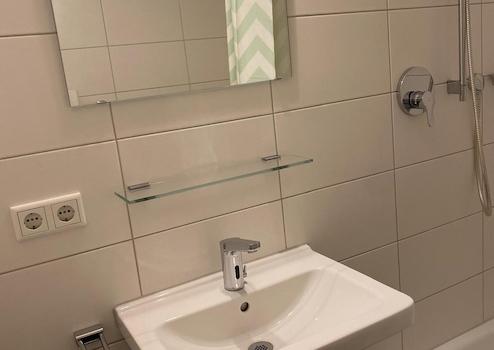Das Komfort-Badezimmer bietet eine Dusche, einen Handtuchheizkörper, ein Waschbecken, sowie nützliche Ablageflächen.