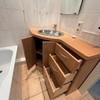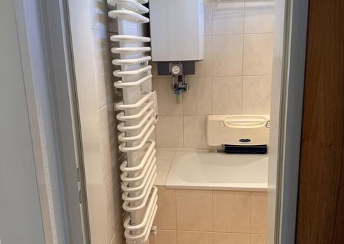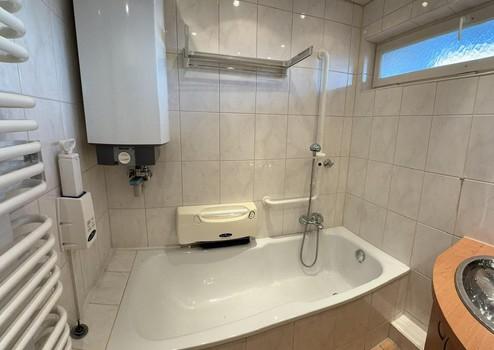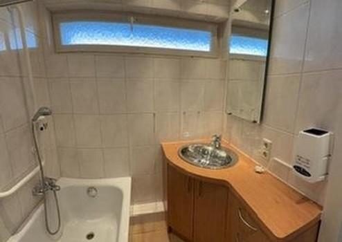 Badezimmer mit Badewanne, Handtuchheizkörper & Waschbeckenschrankkombination