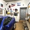 Durch die relativ große Garage, in der neben dem Pkw auch genug Raum für Werkzeug bleibt, gelangt man in einen Holzschuppen.