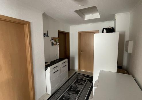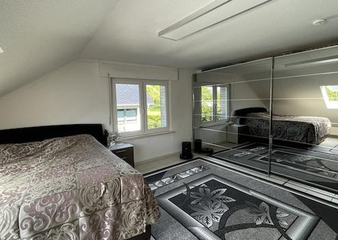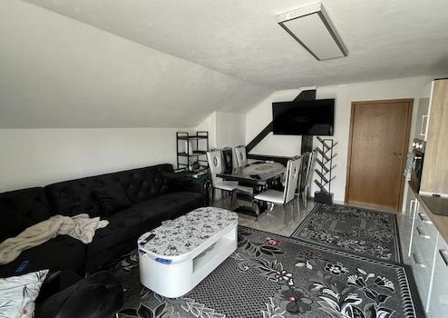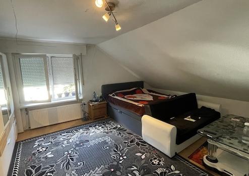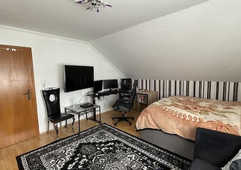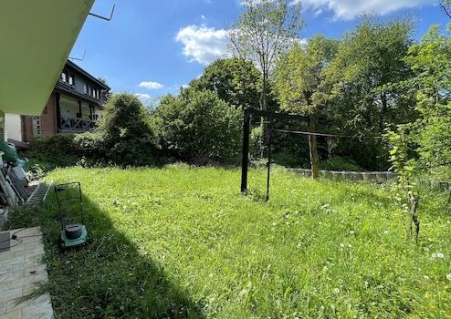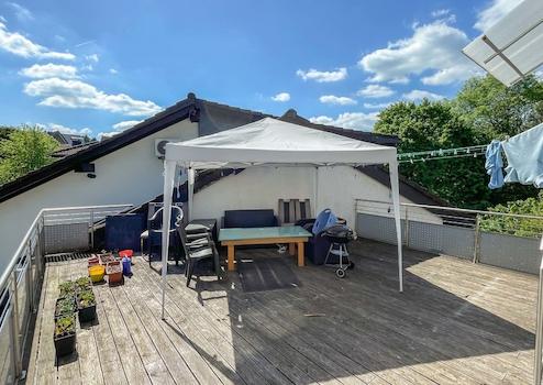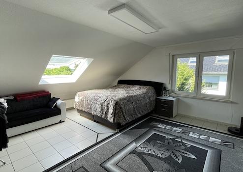 - DG (vermietete EH): Die ca. 108 m² große Wohnung wurde Ende 1994 durch eine genehmigte Nutzungsänderung offiziell als zweite Wohneinheit etabliert. Mit fünf Zimmern und eigener Terrasse ist sie derzeit für 800 € Kaltmiete p.M. vermietet.