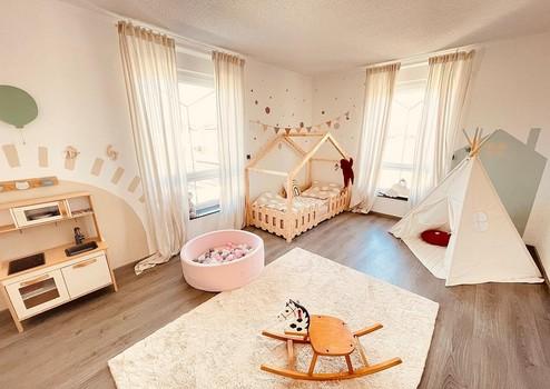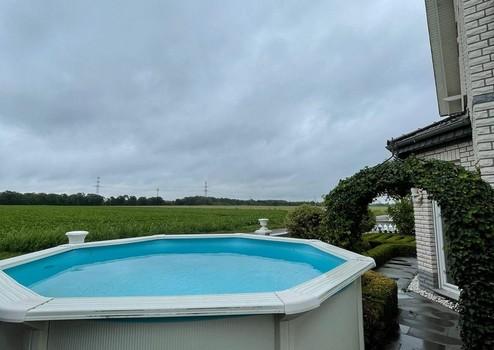Vom lichtdurchfluteten Wohnzimmer gelangen Sie direkt auf die überdachte Terrasse, die mit einem Pizzaofen ausgestattet ist – perfekt für gesellige Abende mit Familie und Freunden. Der liebevoll angelegte Garten lädt zum Entspannen ein und bietet mit seinem eigenen Pool einen unverbaubaren Blick über die angrenzenden Felder – ein echtes Highlight für Naturliebhaber und Ruhesuchende.