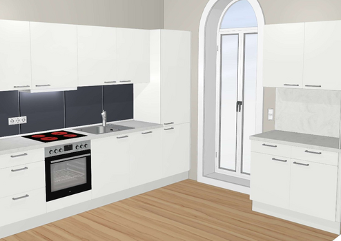 - Vollständig ausgestattete Küche mit weißen Hochglanzfronten