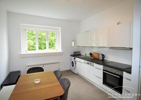 Die Wohnung ist möbliert und verfügt über ein Schlafzimmer und ein Wohnzimmer. Waschmaschine und Geschirrspüler sind vorhanden. Im Wohnzimmer gibt es einen Essbereich und ein großes, gemütliches Sofa. Die Küche ist sehr geräumig und bietet einen weiteren, kleinen Esstisch.