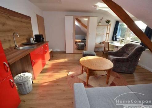 Diese Wohnung liegt im Dachgeschoß eines Einfamilienhauses. Um in das Badezimmer zu gelangen muss man über den Flur gehen. Das Zimmer ist mit einer gemütlichen Couchgarnitur, einem Sessel und einem Kleiderschrank ausgestattet. Vor dem Fenster befindet sich ein Schreibtisch mit einem schönen Ausblick. Das Bett ist etwas separiert am Ende des Raumes. Die Küchenzeile vervollständigt das Zimmer. Das Apartment ist perfekt für 1 Person. Ein PKW-Stellplatz ist vorhanden.