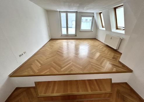 Herzstück der Wohnung ist das große Wohnzimmer, das sich in zwei Bereiche gliedert. Eine kleine Stufentreppe trennt die Ebenen auf elegante Weise und bietet Raum für einen separaten Essbereich. Der Kamin verleiht dem Wohnraum eine gemütliche Atmosphäre und unterstreicht den besonderen Charakter der Wohnung. Von hier aus gelangen Sie direkt auf die großzügige Dachterrasse, die zum Entspannen im Freien einlädt.