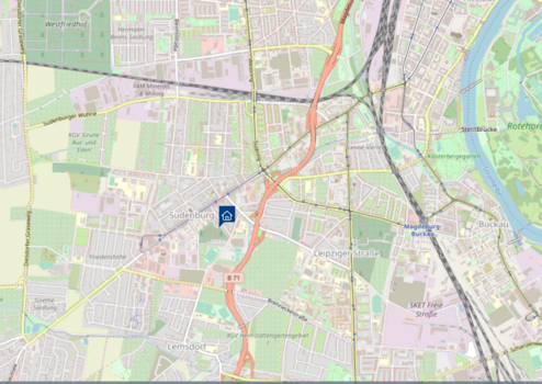 Unsere Etagenwohnung liegt im Stadtteil Buckau, der für sein städtisches Flair bekannt ist. Die Wohnung befindet sich rund 2,4 Kilometer südlich vom Stadtzentrum, was eine gute Balance zwischen Ruhe und urbaner Nähe bietet. Die nächste Zugstation, Magdeburg-Buckau, ist etwa 800 Meter entfernt und kann in wenigen Gehminuten erreicht werden. Ebenso ist die Bushaltestelle Stadthalle in unmittelbarer Nähe. Die Straßenbahnhaltestelle Budenbergstraße liegt direkt vor der Haustür, was eine bequeme Anbindung an den öffentlichen Nahverkehr ermöglicht.