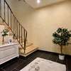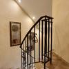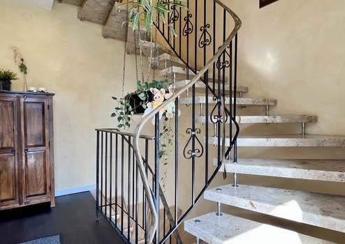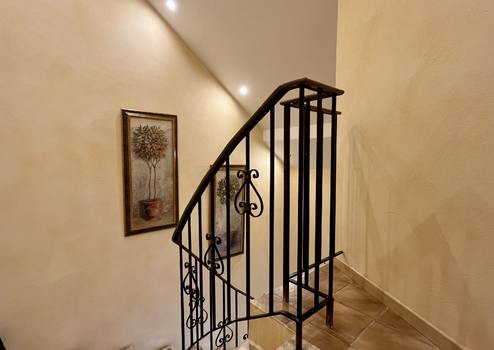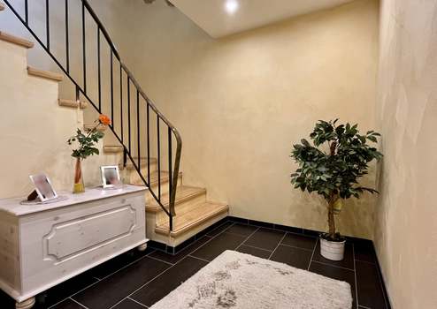 Der Eingangsbereich mit schwebender Marmortreppe liegt auf der Ostseite. Die Haustür und die Tür vom Nebeneingang bzw. Außenkellerzugang wurde 2013 erneuert.