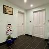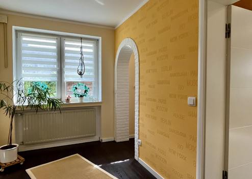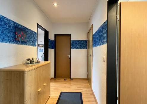 Im Flur gelangt man durch einen ansprechend gemauerten Rundbogen zur Garderobe und zum sanierten Gäste-WC.