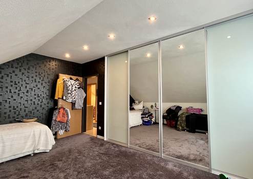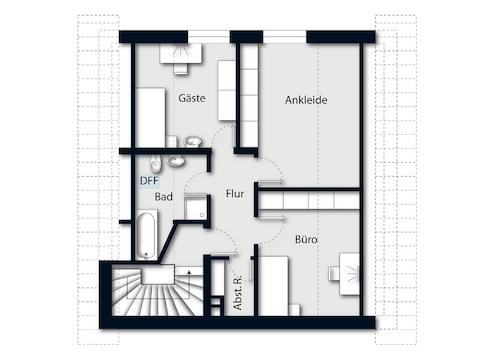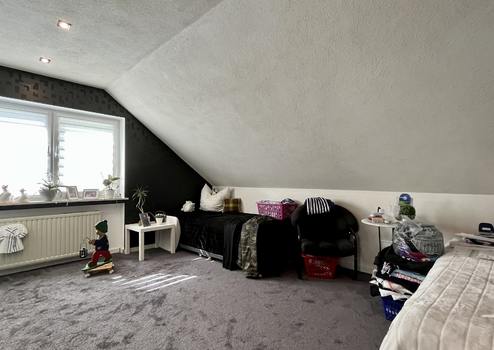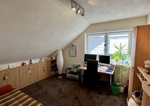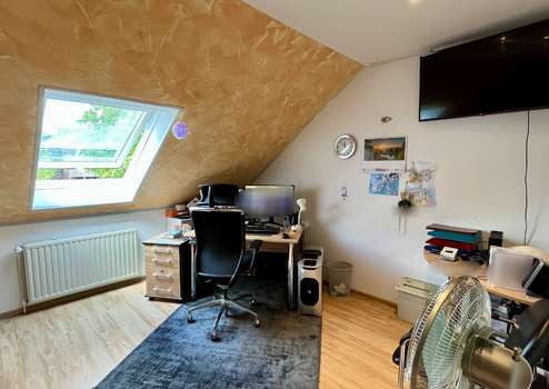 Die Räume im Obergeschoss sind mit ca. 51 m² Wohnfläche gut aufgeteilt. Es stehen drei Schlafzimmer zur Verfügung. Ein Schlafzimmer wird derzeit als Büro genutzt eine weiteres Schlafzimmer als Ankleidezimmer und das dritte Schlafzimmer als Gästezimmer. Das Familienbad ist voll ausgestattet mit einer Badewanne, einer Dusche, WC und Waschbecken. Das Bad und Büro haben neue Dachfenster. Ebenfalls haben zwei Schlafräume, sowie das Badezimmer eine indirekte Deckenbeleuchtung.
