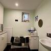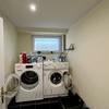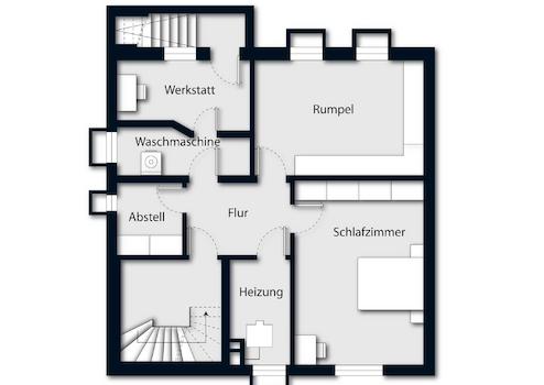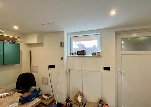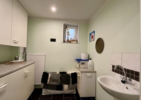 Im Waschraum stehen die Waschmaschine und der Trockner erhöht auf einem gemauerten Podest. Links neben dem Waschraum befinden sich ein Waschbecken und Schränke zum Lagern. Der Werkraum bietet viel Platz für Ihre Hobbies und von hier aus geht es durch den Außenkellerzugang in den Garten.