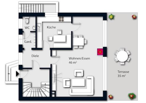Von der Diele aus kommen Sie in alle Räume bzw. ins Keller- oder Obergeschoss.