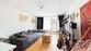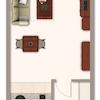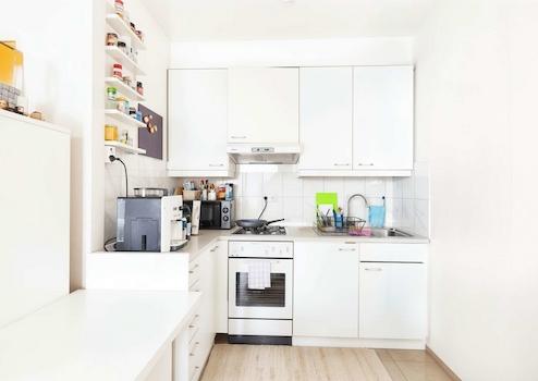 Der Wohnraum ist offen konzipiert und vereint Wohnen, Schlafen und Essen in einem Raum. Die Küchennische ist sinnvoll in den Wohnbereich integriert und ermöglicht eine flexible Nutzung des Raumes.